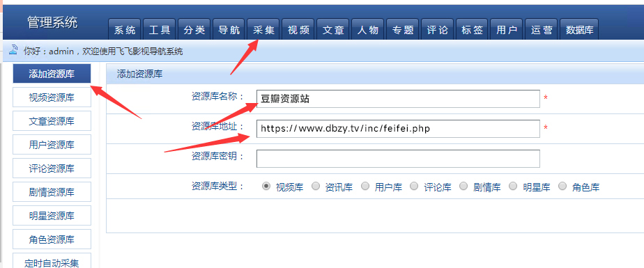 请按以下步骤进行:依次点击【采集】-【采集资源库管理】,然后依次输入