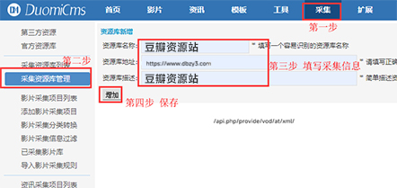 请按以下步骤进行:依次点击【采集】-【添加资源库】,然后依次输入