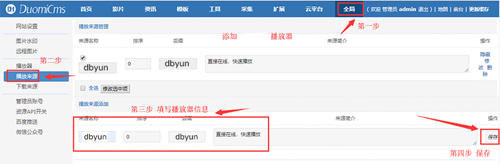 需要先再网站后台添加对应的播放器,然后再安装对应的播放器文件,才可以实现播放,以dbm3u8的资源为例(还有一个dbyun)